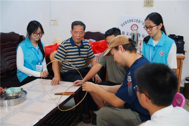 夏令午后,汕尾陆河县河田镇的河田高景传承基地里,广州华商学院潮艺榫韵“百千万工程”突击队队员陈钰考在教悔着这根流传百年的景梗。指尖抚过上头斑驳的萍踪,这根承载着百年非遗操心的钢条,此刻正被队员们反复丈量。