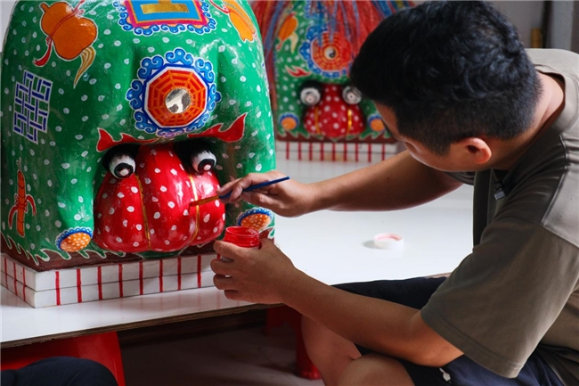 接着,陈文山指导弟子刘德放进行狮头的上色,陈文山指出从骨架制造完成到上色也需要好多工序,骨架晒干后还要往上糊五至七层纸,层层重叠,才气保证景物的褂讪性。一个景物的制作齐需要数日以至数月才气完成,河田高景的景物准备证据了什么是“慢工出细活”。